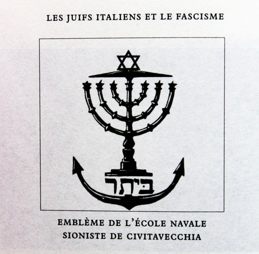 “The cadets (around 150 in four years), sported an emblem combining an anchor, a menorah and a Star of David, and the other side of their uniform was decorated with little bundles of rods…” – the fascist symbol. [39]