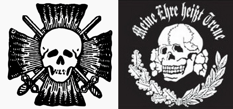 This organisation, banned by the Front populaire government in 1936, was originally an ex-servicemen’s group but is considered by some to have been “fascist” – its death-head logo (left) certainly resembles the Nazi SS Totenkopf (right). [19]